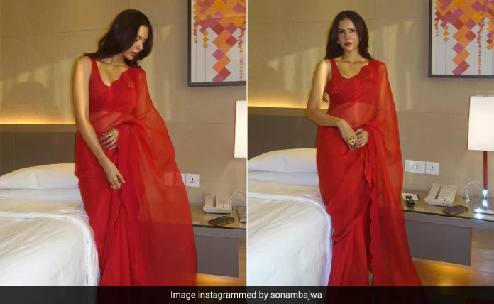 On Instagram, Sonam Bajwa appears hot in a red saree.